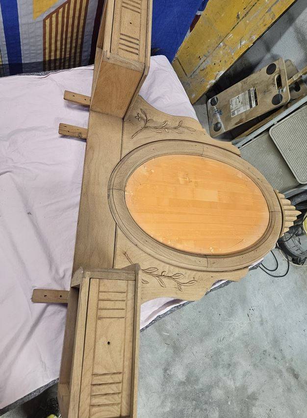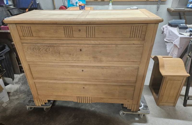 décaper la commode tout en douceur et sans aucune altération. Elimination totale de la vielle peinture et retour à l'état brut du bois, pour une bonne accroche, le travail de préparation s'est terminé par un léger sablage.