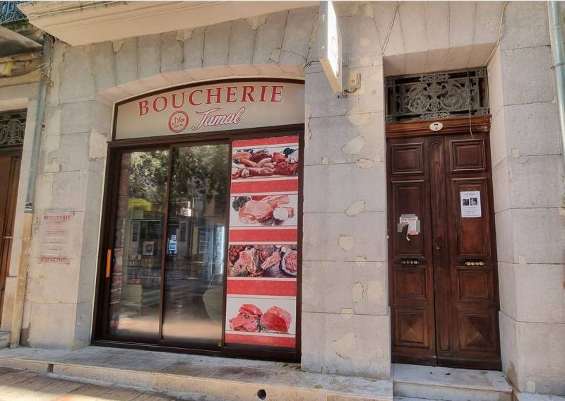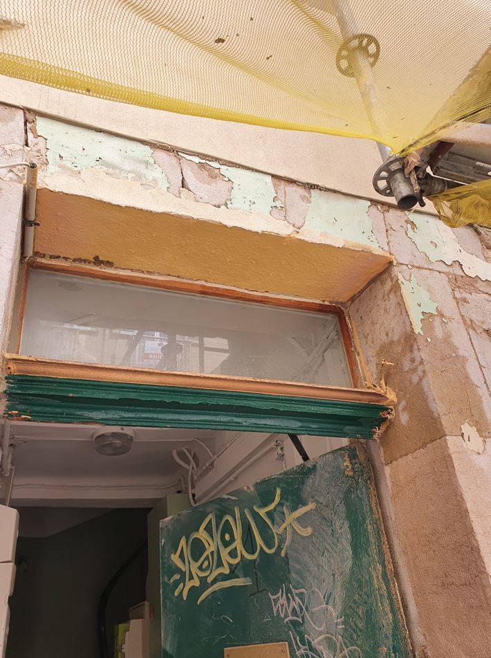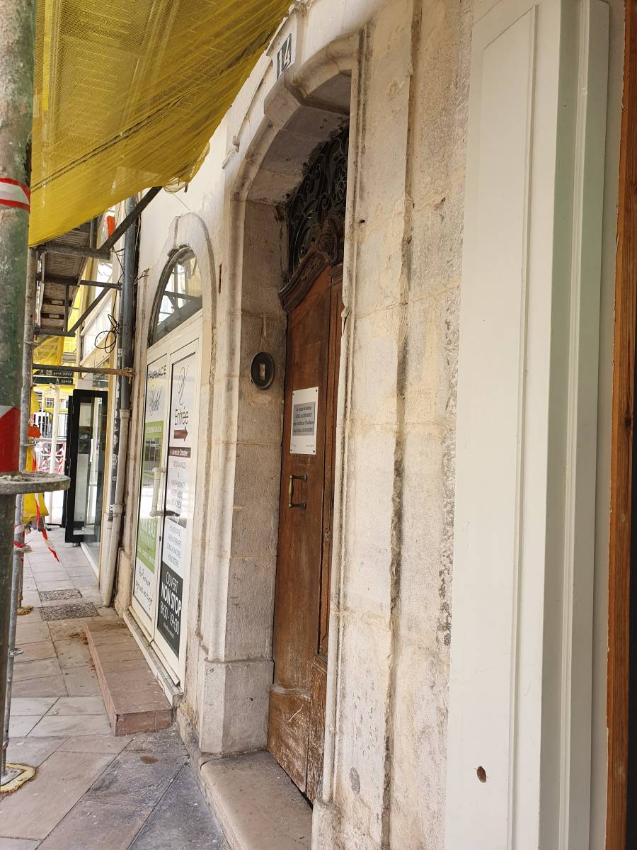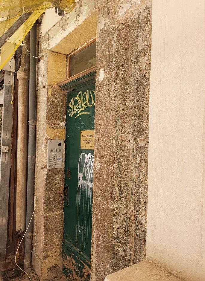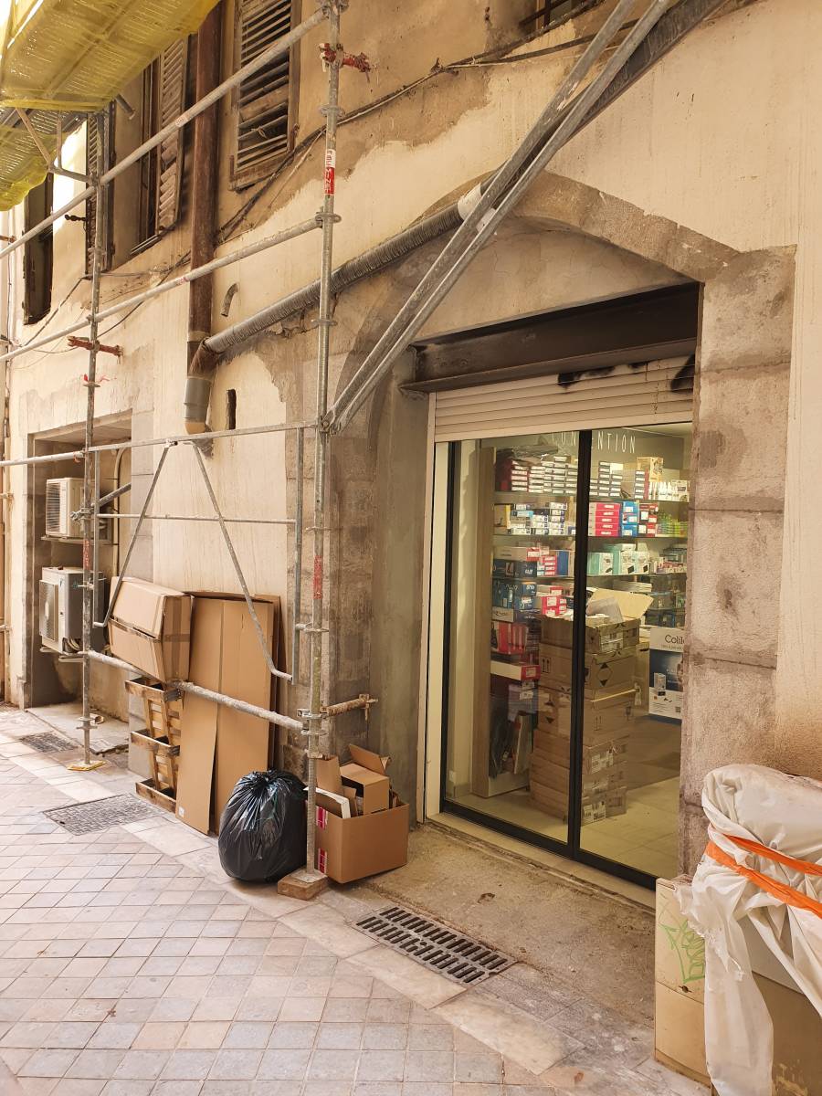 hydrogommage sur façades de commerces à Toulon (pharmacie, boucherie) et le nettoyage de tags sur les portes d'entrées attenantes.